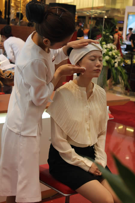 嬌韻詩(shī)專柜導(dǎo)購(gòu)用專業(yè)手法為顧客現(xiàn)場(chǎng)做植物精華護(hù)理